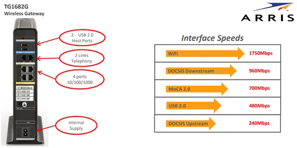 - El Arris TG1682G es un módem de cable WiFi con telefonía compatible con los servicios de internet de Xfinity y Cox.